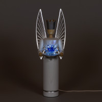 Im Teller sind drei weiße LEDs eingelassen, welche nacheinander sanft aufleuchten und den blau-transparenten blütenähnlichen "Edelstein" darüber zum "Funkeln" bringen. Dazu leuchten rückseitig die gravierten Flügel aus Acrylglas.