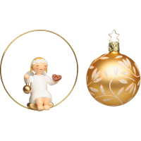 Meisterschaft hoch zwei: Am Weihnachtsbaum wird es in diesem Jahr gleich doppelt schön – mit einem größeren Margeritenengel im Ring, ergänzt um eine mundgeblasene Gaskugel der Manufaktur INGE-GLAS®. Die Form dieser Glaskugel entspricht der Holzkugel des Engels – eine wundervolle Verbindung zweier zauberhafter Accessoires. Und noch etwas eint die beiden: ihre meisterhafte Fertigung in liebevoller Handarbeit. Nach jahrhundertealter Tradition wird die Kugel frei vor der Flamme geblasen und von Hand bemalt. Das weihnachtliche i-Tüpfelchen bildet der Goldglimmer, der im Wechselspiel mit dem matten Untergrund die Kugel durch feine Ranken zum Glitzern bringt.